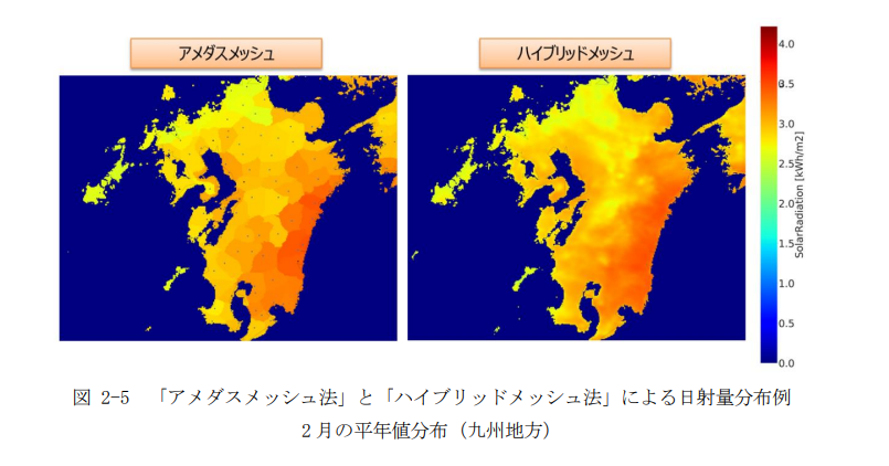現在、日本における日射量のデータは、国立研究開発法人新エネルギー・産業技術総合開発機構(NEDO)が提供する「日射量データベース閲覧システム」で公開されています。このデータベースで用いられている「ハイブリッドメッシュ法」は、従来の「アメダスメッシュ法」よりも詳細な日射量データを提供しています。