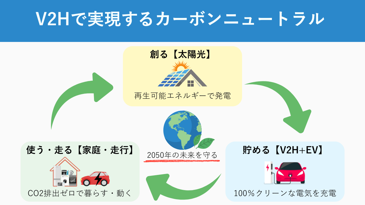 V2Hを導入することで、普段は移動手段であるEVを「大容量の定置型蓄電池」として、災害時の備えや日常の電力コスト削減に活用できるようになります。