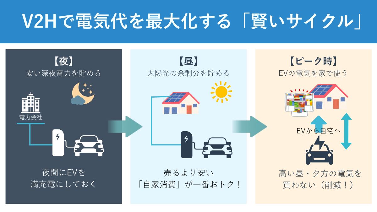 夜間: 電力単価が高くなる夕方や夜に、EVから家へ給電。