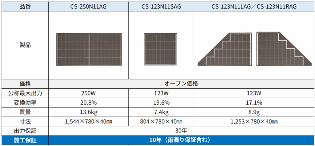 「製品保証」「出力保証」などは全メーカー共通の保証ですが、長州産業は業界で唯一「施工保証(雨漏り保証)」を付帯しています。