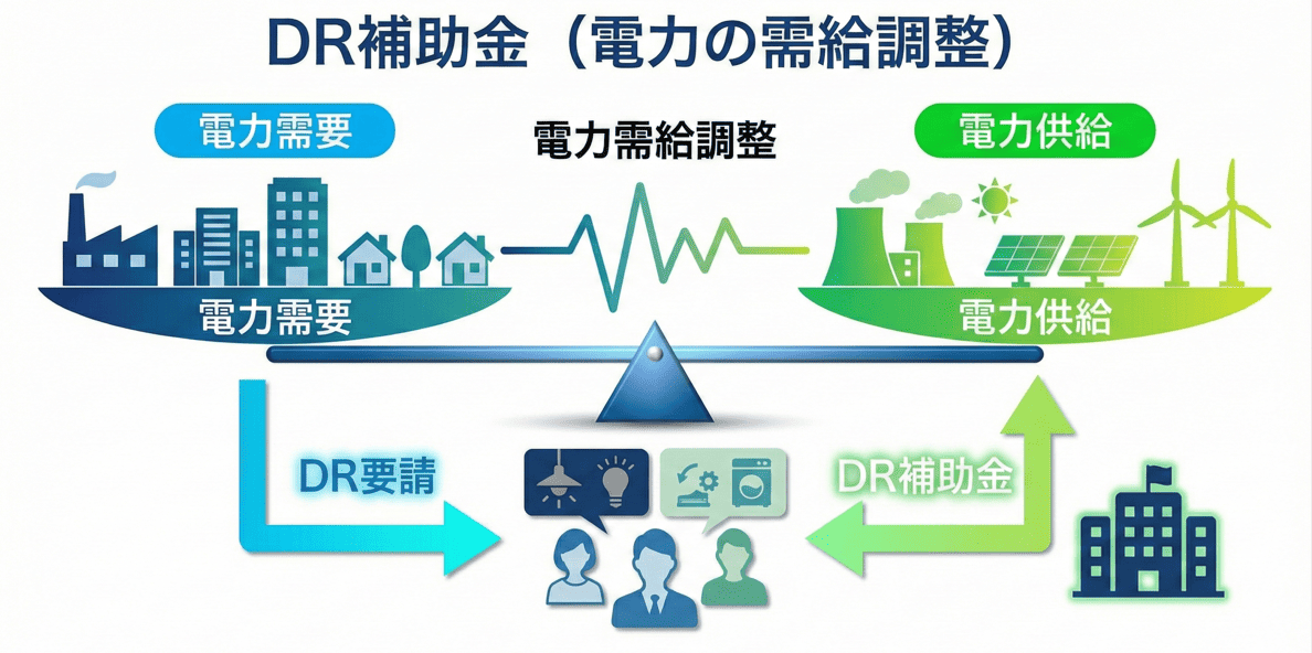 DR補助金(正式名称:再生可能エネルギー導入拡大・分散型エネルギーリソース導入支援等事業費補助金)とは、太陽光発電などの再生可能エネルギー機器の導入を促進し、長期停電や電力需給ひっ迫時に活用できる電源を確保することであり、電力の需給バランスを調整する「ディマンドリスポンス(DR)」のことを指します。