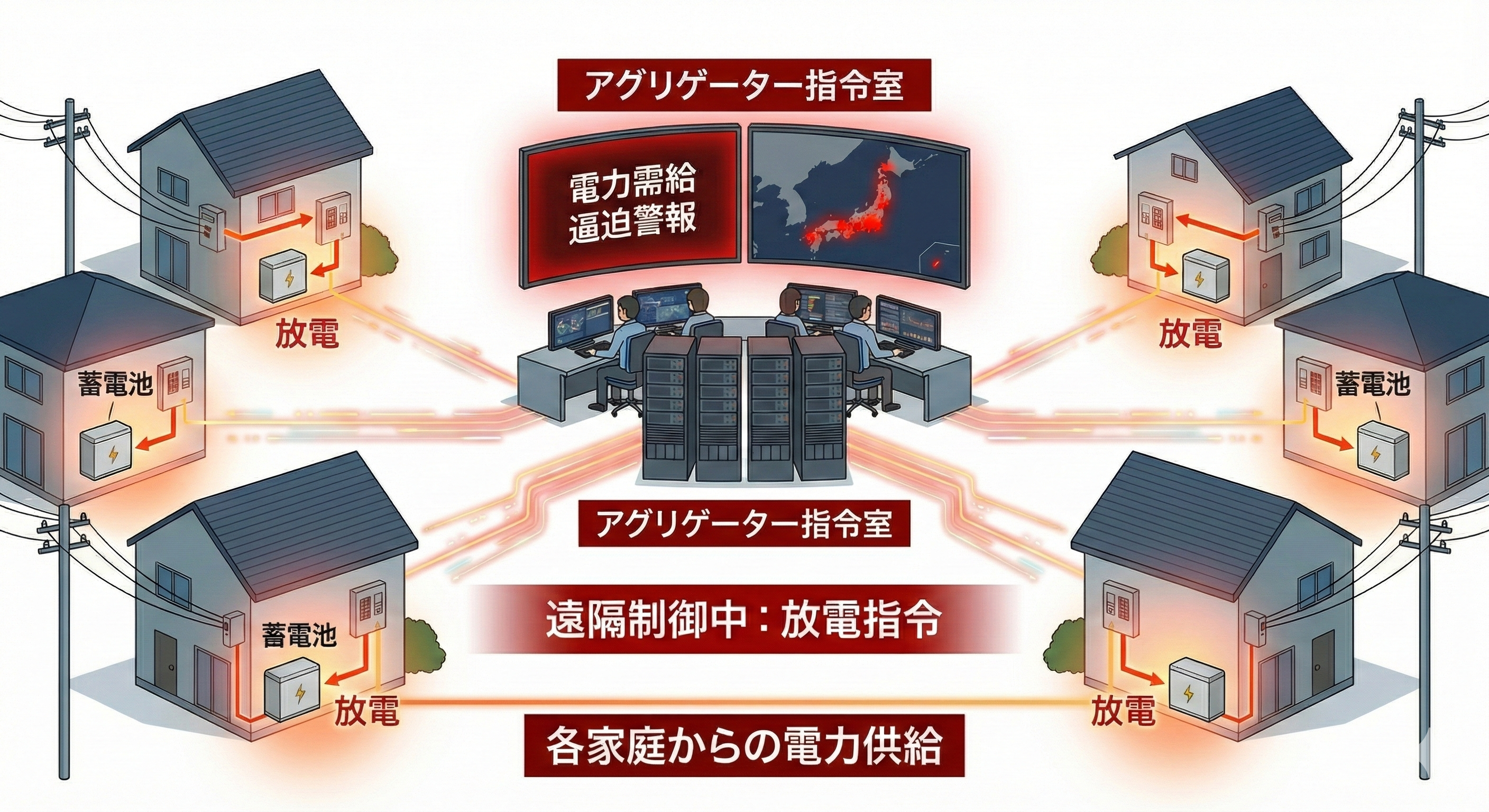 蓄電池アグリゲーターは、電力需給のひっ迫時や再生可能エネルギーの出力制御発令時に、需要家の所有している蓄電池でDRを行う事業者を指しています。