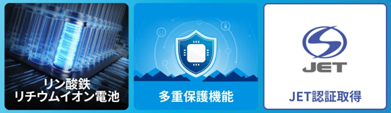 電池ユニットには安全性の高いリン酸鉄リチウムイオン電池を採用し、電池パックごとに8つのセンサーを搭載することで、エラー検知に優れる等、多重の保護機能を備えることで安全性を高めています。