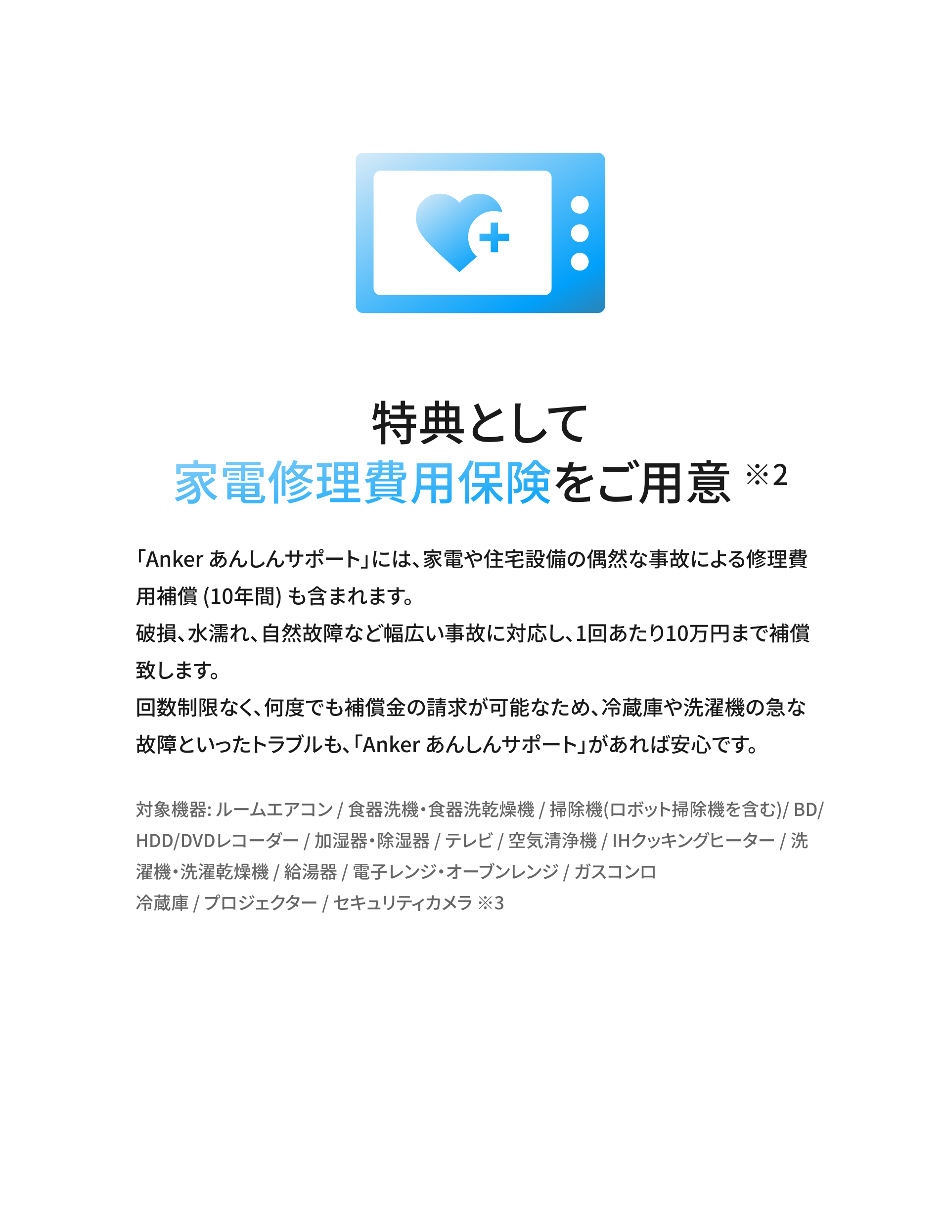 破損・水濡れ・自然故障など、幅広い事故に対応し、1回あたり10万円まで補償してくれます。