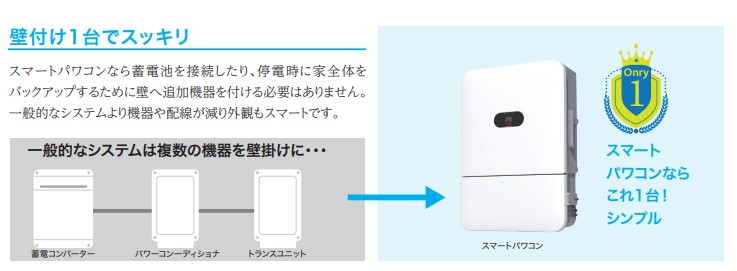 一般的なシステムは蓄電コンバーター・パワーコンディショナ・トランスユニットを壁付けしますが、スマートパワコンならシンプルに1台の設置で済みます。