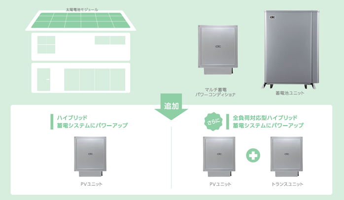 最初は単機能蓄電システムで導入しておいて、後からPVユニットを導入しハイブリッドタイプにすることも可能です。