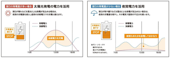 翌日の天気情報に基づき、夜間の充電量を操作不要・自動で制御します。