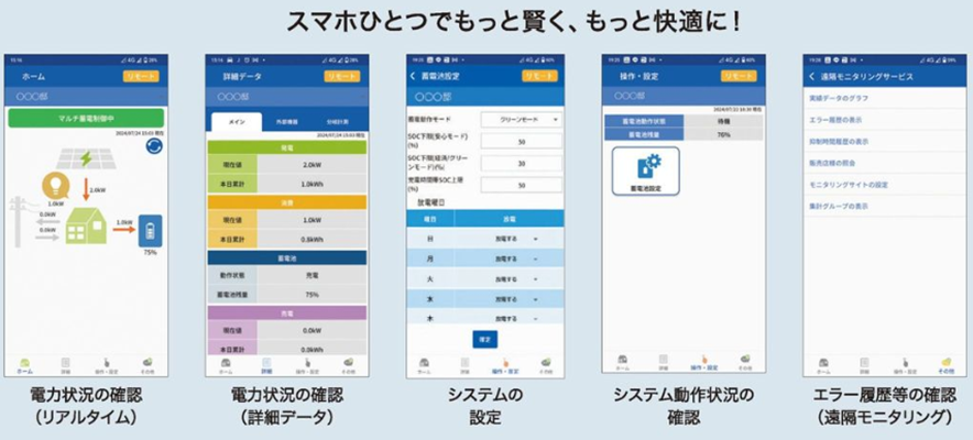App StoreやGoogle Playで「エネルギーシステムコントローラ」と検索し、アプリをダウンロードしていただくことによって、スマートフォンからでも手軽にモニタリングや設定を行えます。