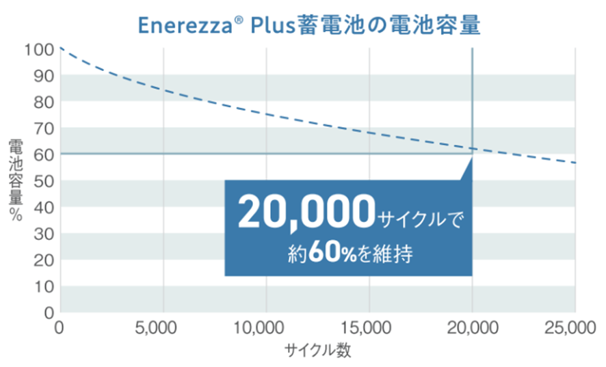 前モデルであるエネレッツァ(EGS-LM0500)からさらに改良が加えられた、クレイ型リチウムイオン電池を搭載したことで、業界最長である20,000サイクルを実現しています。