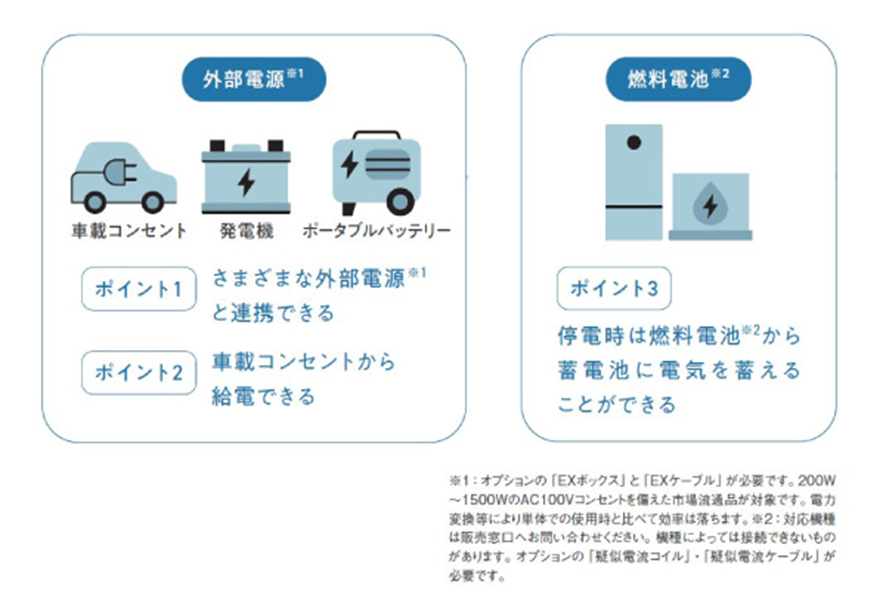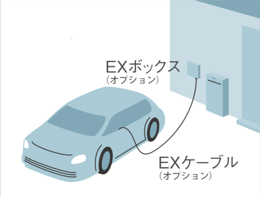 外部電源から電気を共有することができるEXボックス(オプション品)は他の製品にはない、エネレッツァプラスの特別な機能です。