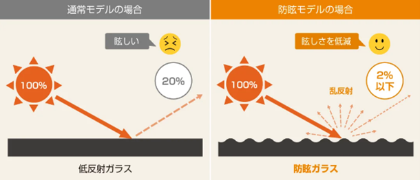 シャープの防眩モデルは、パネル表面のガラスに凹凸加工を施すことで光を乱反射させ、一方向への反射を小さくしたことで眩しさ低減させることに成功しています。