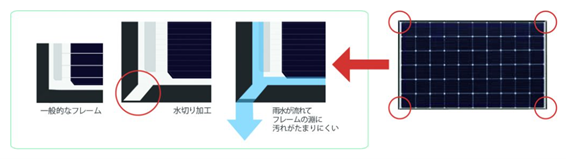 エクソル製の住宅用モジュールは、すべてのモデルに水切り加工が施されており、雨水が溜まることによる汚れで発電量が低下することを軽減しています。