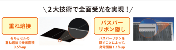 他にも、セルとセルの連結に独自の重ね溶接を採用していることで各セル間の隙間が完全になくなり受光面積0.5%アップに成功しています。