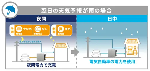 V2Hと連携させることで電気の「消費」と「貯蓄」をかしこくマネジメントしてくれます。過去の発電量やご家庭の電力プラン、天気予報などの情報をもとに余剰電力を予測し有効活用しご家庭の省エネにつなげてくれます。