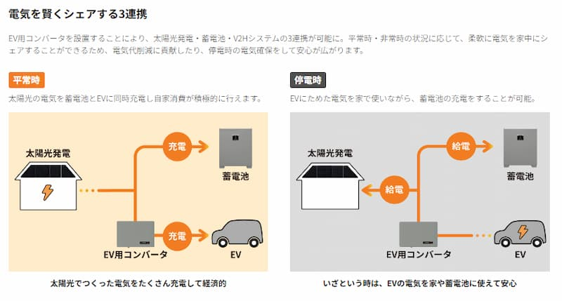 シャープ製V2Hは太陽光・蓄電池・EV(電気自動車)と3つ機器と連携します。