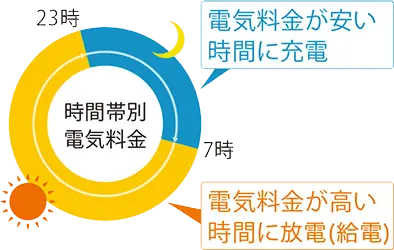 | ①太陽光発電設置なし ②電気契約時間帯別 | 電気代の安い時間帯に充電し消費電力の多い時間帯に放電する |