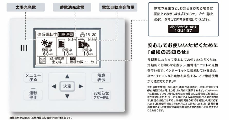 発電や充放電など、運転状況をシンプルにわかりやすく表示します。モード設定などの変更等もネットリモコンから行います。