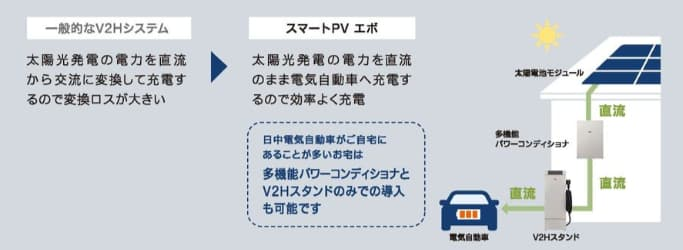 発電した電力は直流のまま電気自動車に直接充電できます。一般的な太陽光発電とV2Hシステムの組み合わせでは一旦交流に変換し、再度直流に変換したうえで充電するのでロスが大きくなります。