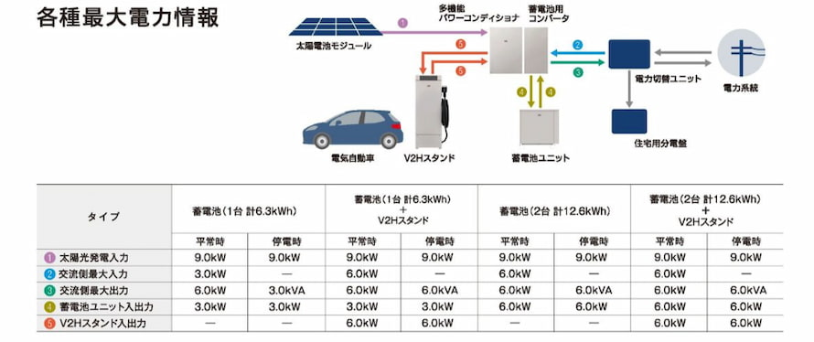 これによって太陽光発電の充電を最大9kW、蓄電池+V2Hからの放電を最大6kWという高出力を実現しています。